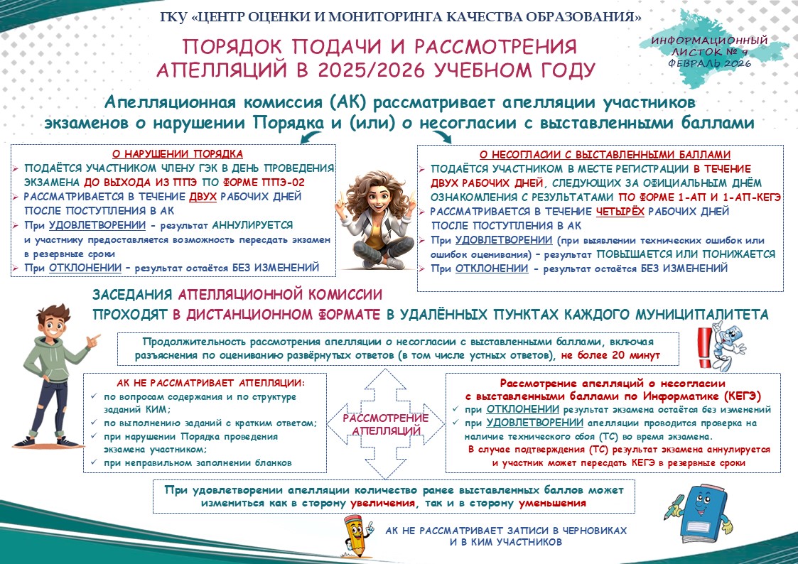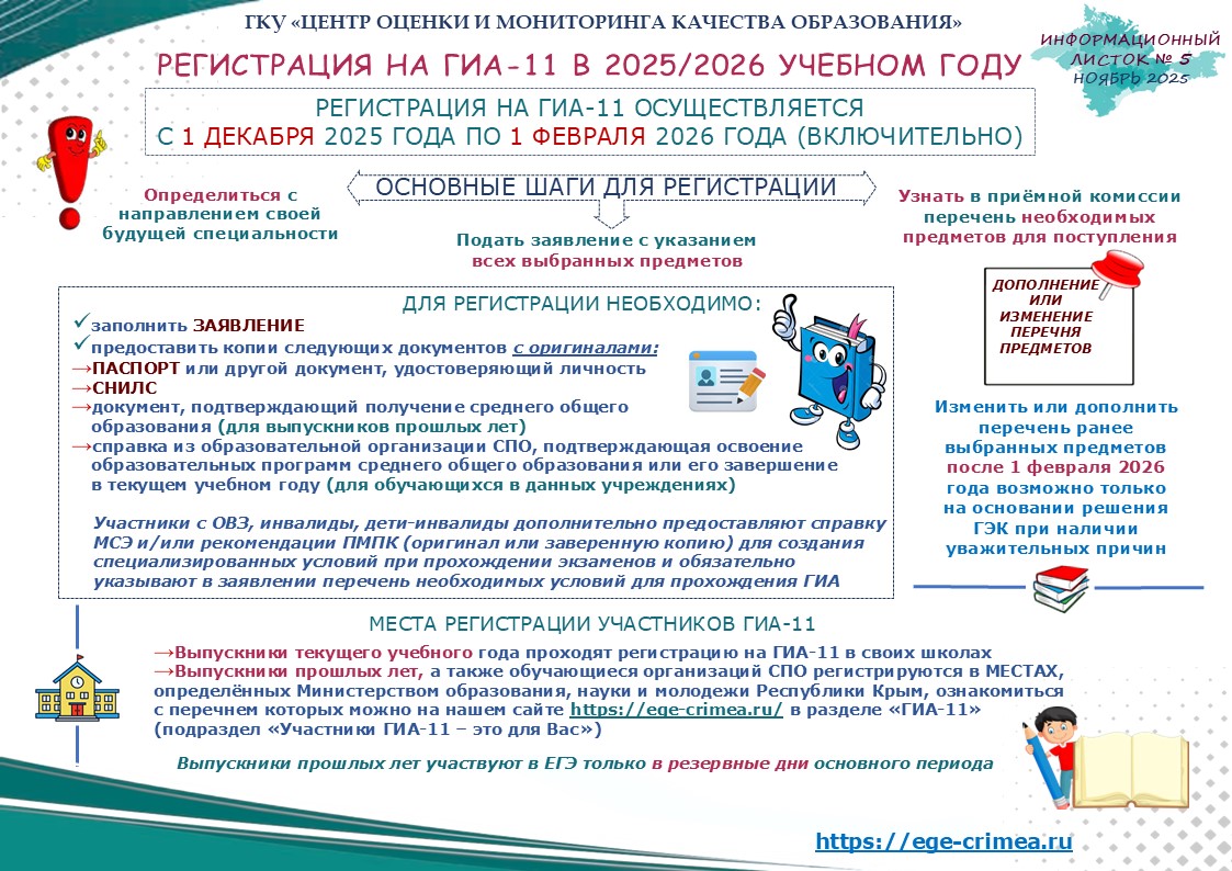 Регистрация для участия в ГИА 2025/2026 учебного года осуществляется со 1 декабря 2025 года по 1 февраля 2026 года (включительно). Регистрация выпускников текущего года осуществляется в МБОУ "ОКЛ им.Г.Т.Берегового" г.Симферополя